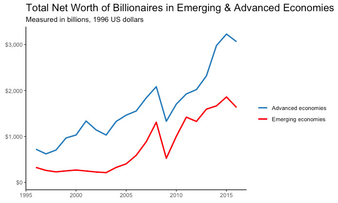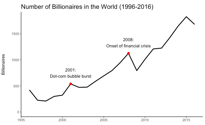显然,从 1996 年到 2016 年,全世界的亿万富翁人数激增(更准确地说,增加了 396%)。但增长的轨迹并非一条直线:2000 年以前增长几乎停滞,2001 年互联网泡沫破裂以及 2008 年金融危机这两个时间节点之后立即出现负增长,尤其以后者最为明显。