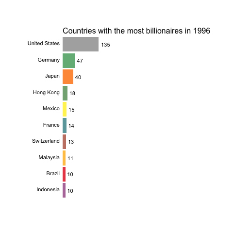这幅图显示了 1996 年 -2016 年间,亿万富翁数量最多的十个国家(和地区)排名。最令人瞩目的发现是:在整个统计周期内,美国丝毫不令人意外地保持了 拥有亿万富翁最多的国家(和地区) 这一称号,即使考虑到人口规模的差异,美国亿万富翁的数量也远多于紧随其后的几个国家(和地区)。除了 1999 年和 2000 年两年意外,美国的亿万富翁数量至少是其他国家的 2.5 倍。