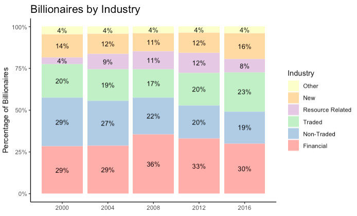 尽管大多数亿万富翁的财富一直以来主要来自金融业,但自 2008 年达到顶峰以来,这一比例一直在稳步下降。另一方面,自 2008 年以来,来自 新技术行业 和贸易行业的亿万富翁比例一直在持续上升。