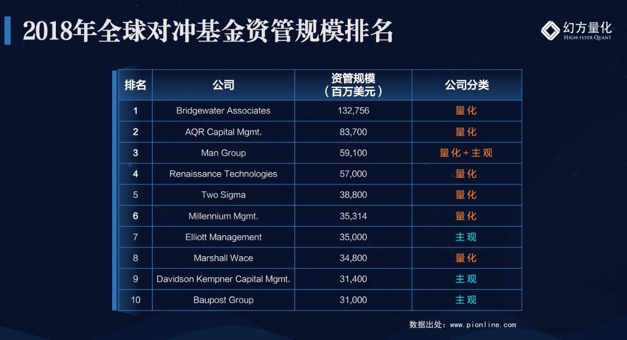 最初的对冲基金都不是量化的,这个表是2004年全球对冲基金资管规模排名的前10名,你看大部分都不是量化的。这是去年2018年的排名,量化已经占了前面的多数,我们熟悉的桥水排名第一,AQR排名第二,文艺复兴排名第四。