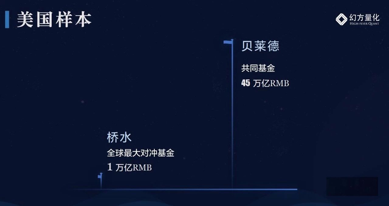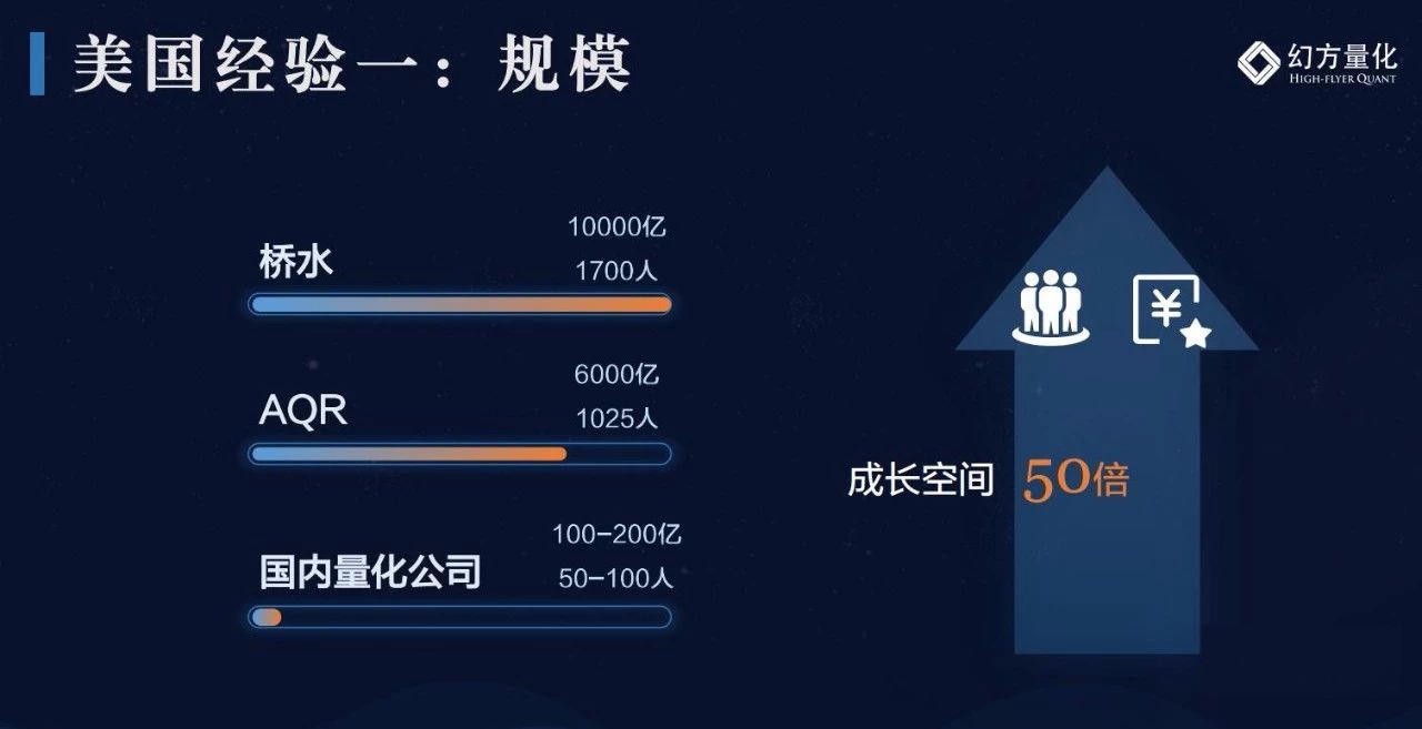 全球最大的对冲基金桥水的管理规模是一万亿人民币左右,而国内大的量化公司在100~200亿之间,我们可能还有几十倍的增长空间。