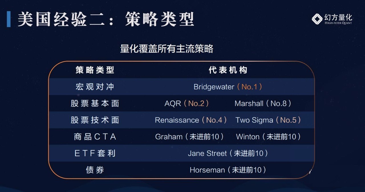 而国内的对冲基金,现在大家主要都是做量价策略,我们整体上比美国是落后的。从美国的经验来看,在策略类型上面,我们应该还有很大的发展空间。