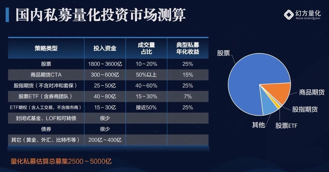 当前投到中国市场的量化的资金,我们估算大概在2500亿到5000亿之间。其中超过一半投到了股票策略,其次是商品CTA,剩下的就很少了。