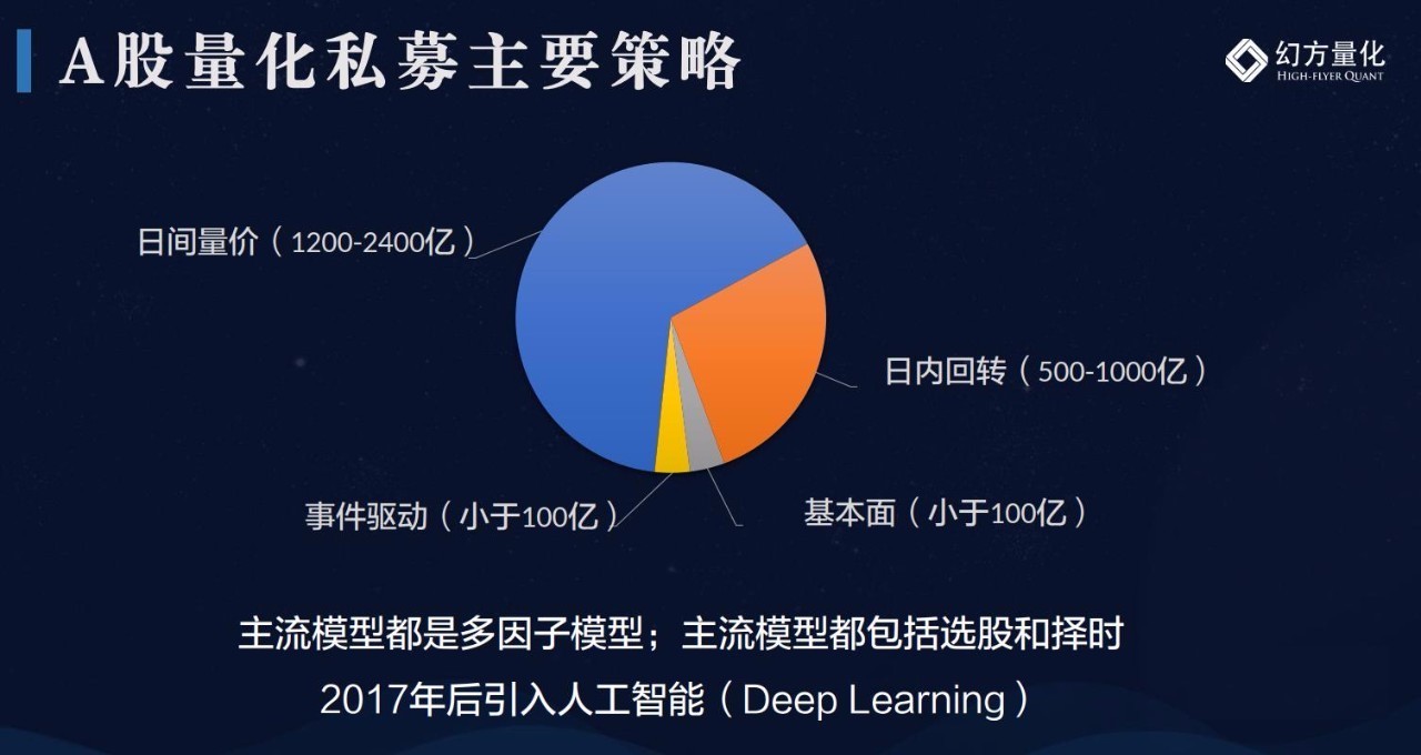 股票策略,传统上我们分成4种,最重要的是第一种日间量价模型。大家经常听说的多因子、alpha其实都是说日间量价模型,规模大概有两千亿。第二重要的是日内回转模型,俗称股票T0,有大几百亿。最后还有两种,基本面模型和事件驱动模型,目前不是重点。
