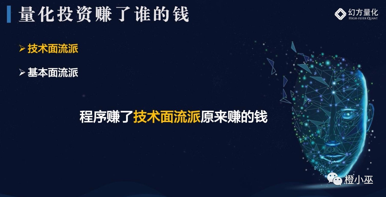 人类投资者分两个流派,一种叫技术面,一种叫基本面。说得更具体一点,现在量化赚的是技术面流派原来赚的钱。谁来告诉我,技术面流派赚了谁的钱?技术面流派现在赚钱已经比以前难很多了,因为程序有两三千亿的钱每天在做同样的事情,使得市场的有效性大幅度提高了。