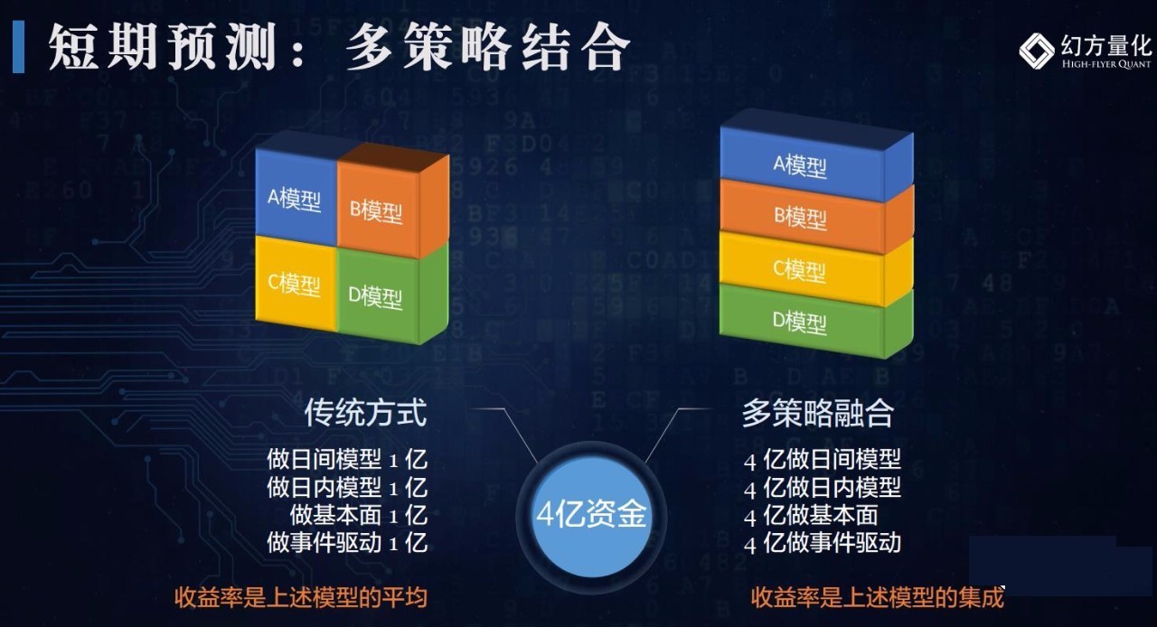 多策略结合并不是简单的分散投资。分散投资是这样的,4亿的资金,1个亿做A模型,1个亿做B模型,1个亿做C模型,1个亿做D模型。这样做的缺点是,收益率是4个模型的平均。