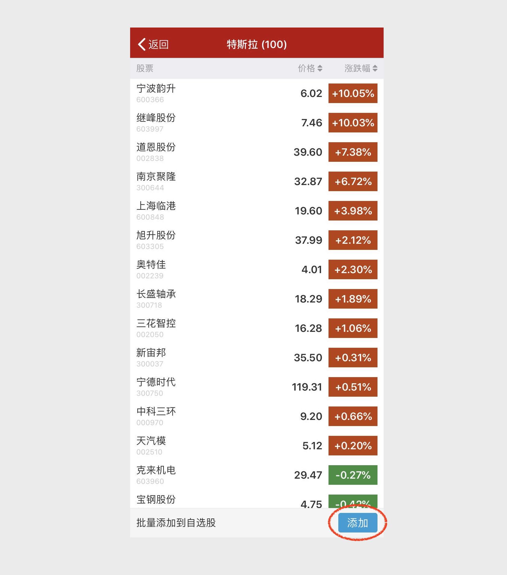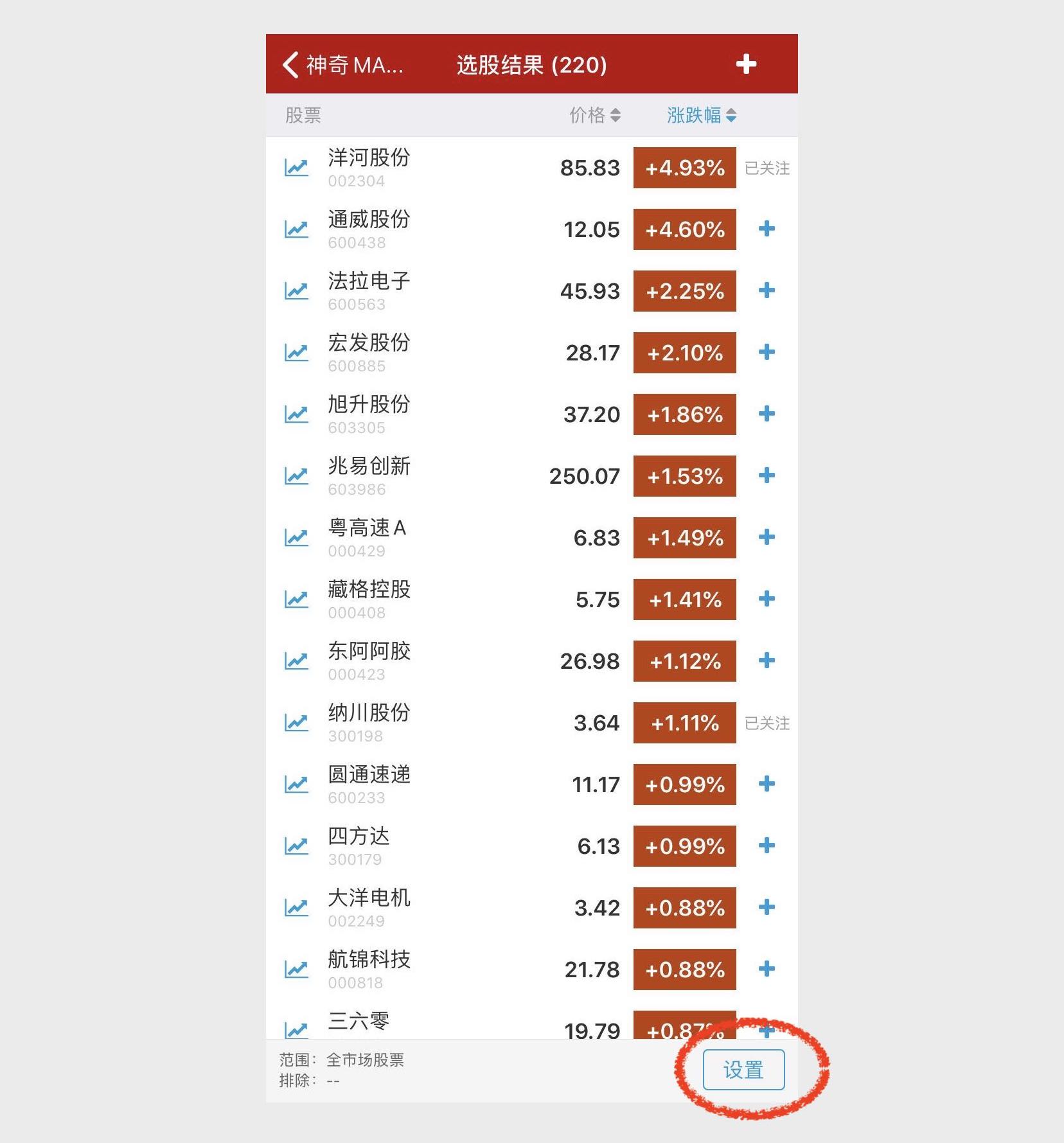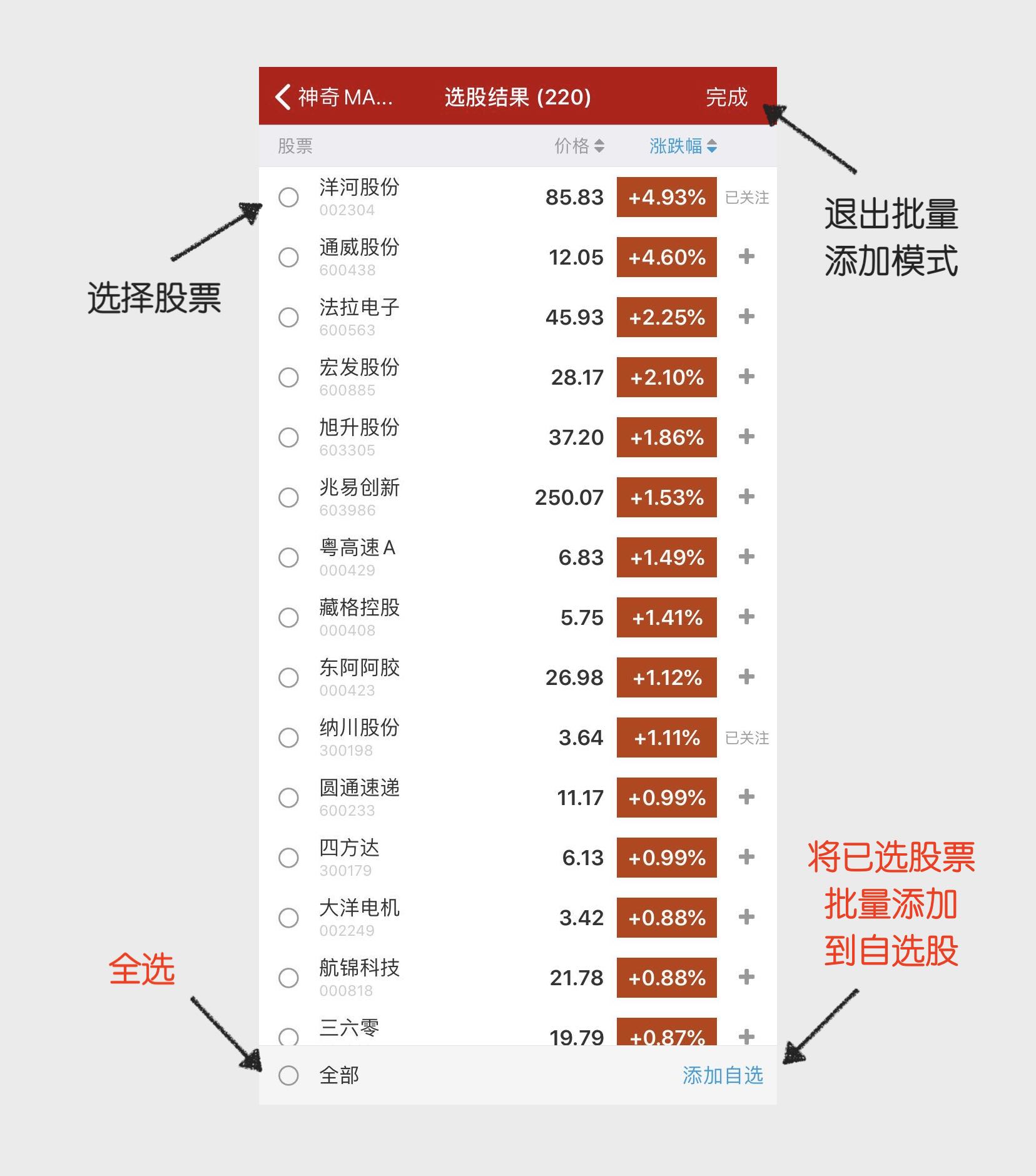 点击页面右上角的“+”按钮,可将选股结果批量添加到自选股中