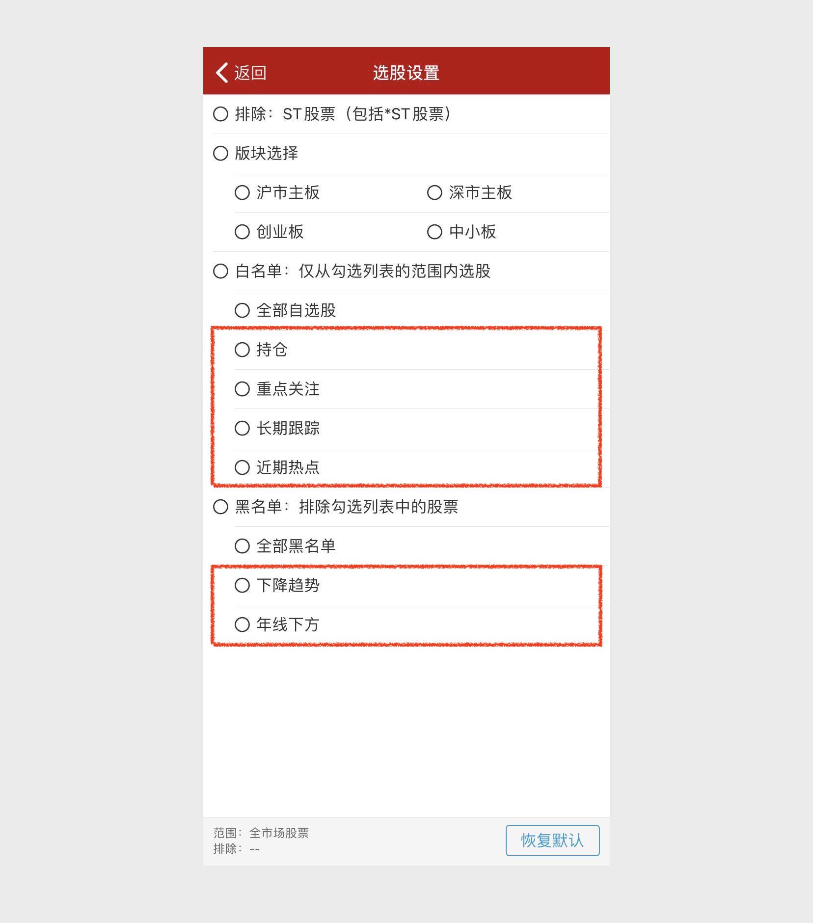 第三个选项,白名单。可以选一个、多个或者所有的自选股分组。选好白名单后,选股结果只会显示在自选股分组中的股票,不在分组中的股票将被滤除。