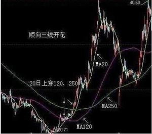 是指在三线开花的初始点,120日均线与250日均线是顺向交叉的状态,即120日均线从下向上穿越250日均线,形成两条长期均线的黄金交叉,此时20日均线从下向上穿越这两条均线交叉点的技术走势形态(交叉点即买入信号)。