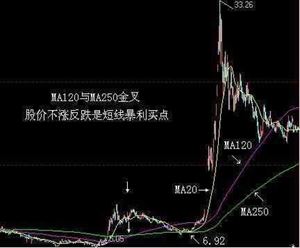 120日与250日均线的金叉买点获利技巧(短线快速暴利买点):120日均线上穿250日均线,形成黄金交叉,此时若股票价格反而是下跌状态,并回跌到120日与250日均线的交叉点附近时,这是一个短线快速获暴利的绝佳买入点。