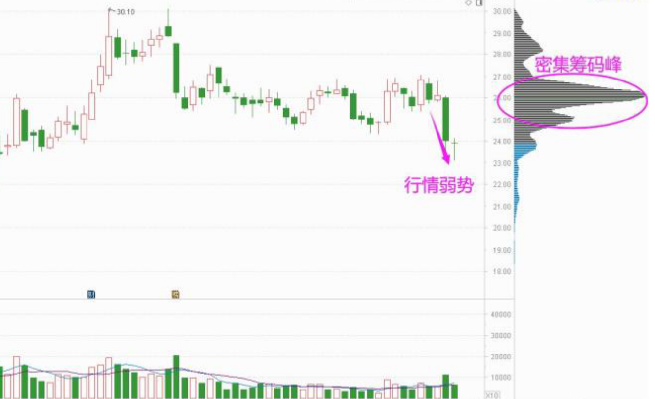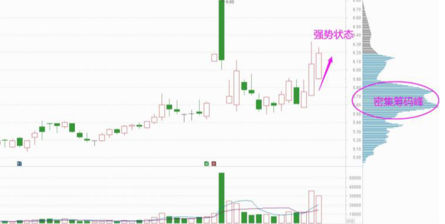 如果个股股价在密集筹码峰的上方,说明行情比较强势,随时会继续上涨;反之,如果个股股价处于密集筹码峰的下方,由于层层套牢筹码的反压,则说明行情弱势,直接拉升是比较困难的: