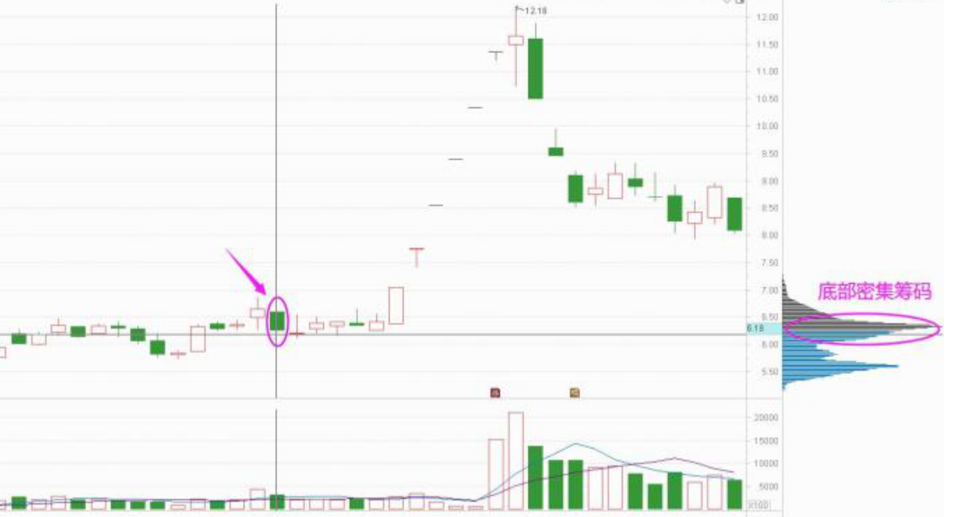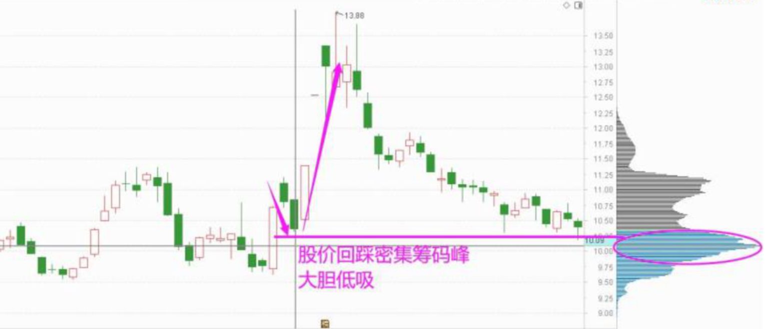 这里面包含的逻辑也很简单,因为密集筹码峰往往包含着主力资金的大量筹码,股价跌到这个位置,主力自然会采取抵抗拉升措施,这就是股价下方密集筹码峰具有支撑作用的原因,基于此,我们就可以在股价缩量跌至这个位置时,大胆低吸。