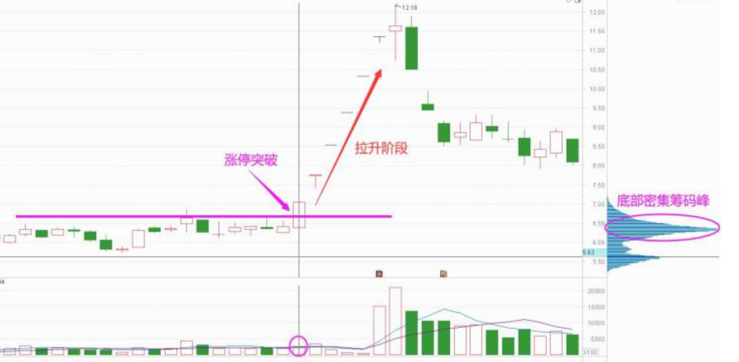 拉升阶段的启动,往往配合消息面、政策面或个股自身的利好,股价放量突破底部密集筹码峰为标志,最强的启动信号,就是以涨停突破: