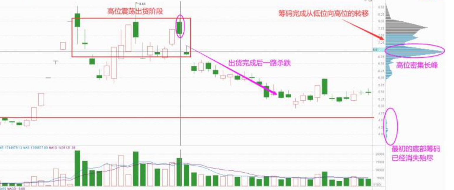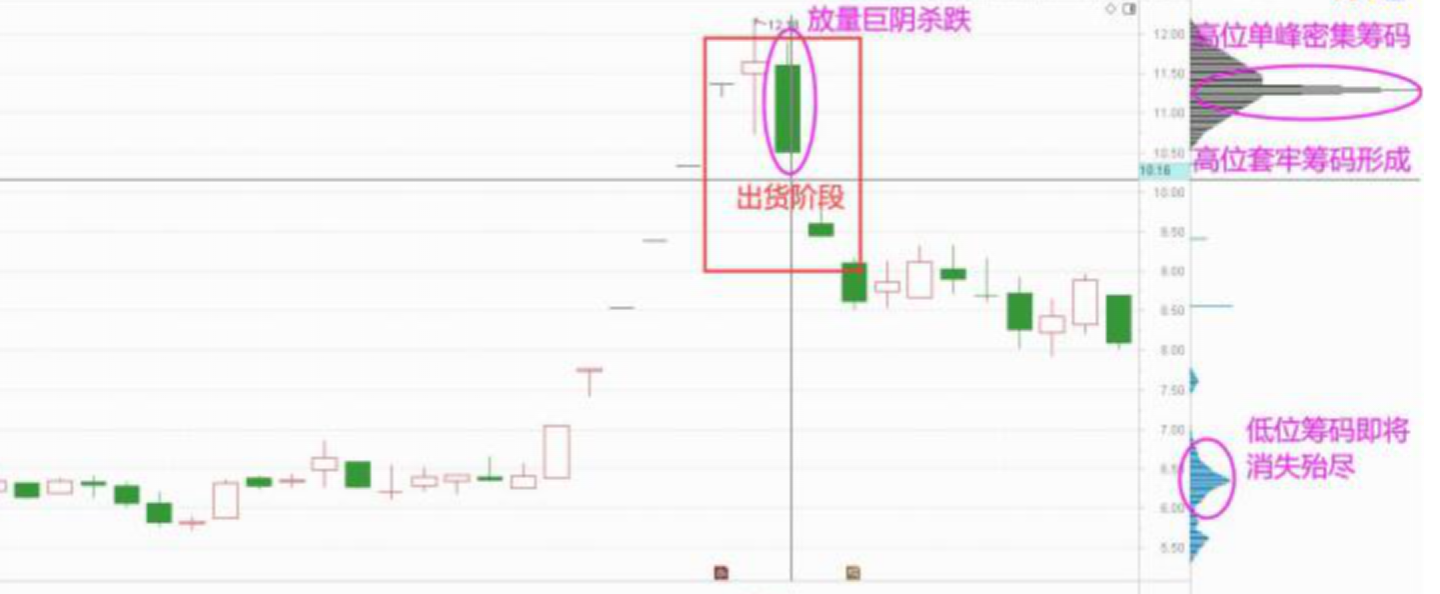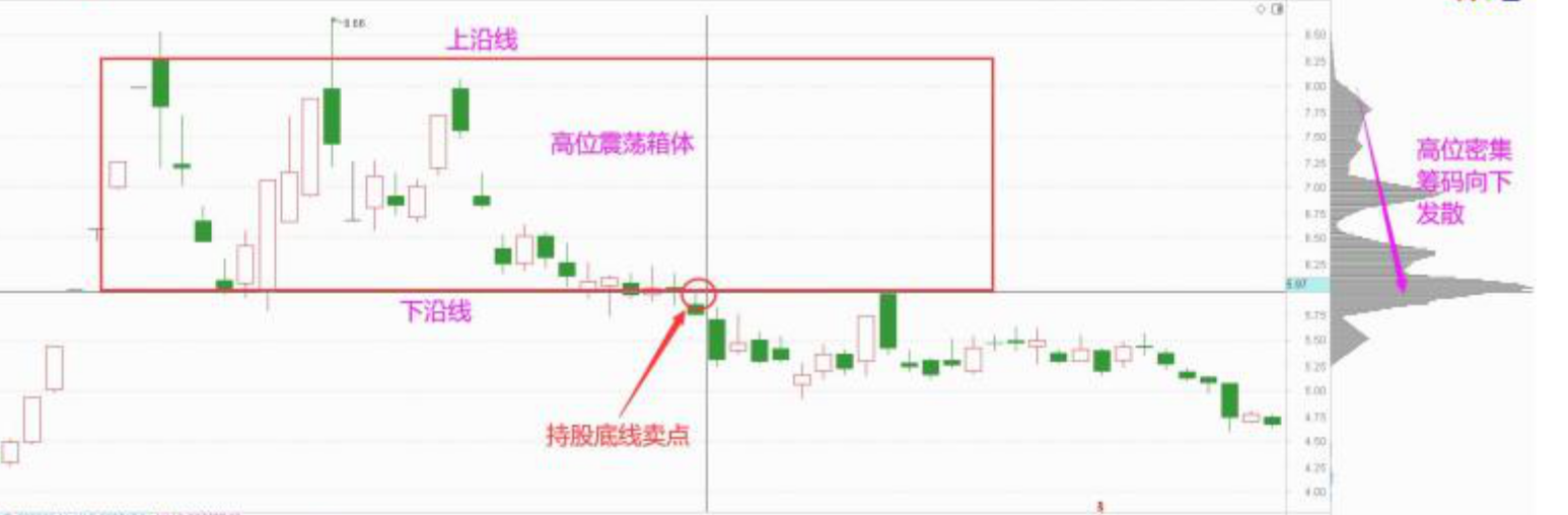 除此之外,还有一个持股底线卖点,即:筹码在高位形成单峰密集之后,随着股价的杀跌,筹码又开始从高位向低位发散时,是持股底线卖点,对应在 K线图上,为股价放量跌破高位震荡箱体的低点(下沿线):