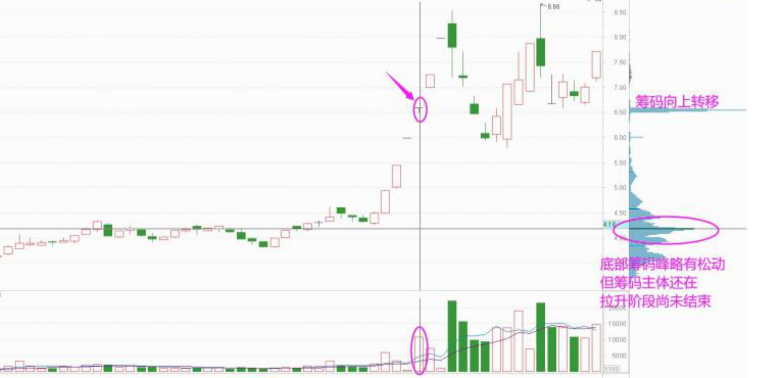 上图可以看到,在拉升阶段,筹码开始随着股价的上涨慢慢向上发散(往往以小散峰状的形态向上发散),但是启动前形成的底部密集筹码峰并没有什么松动。
