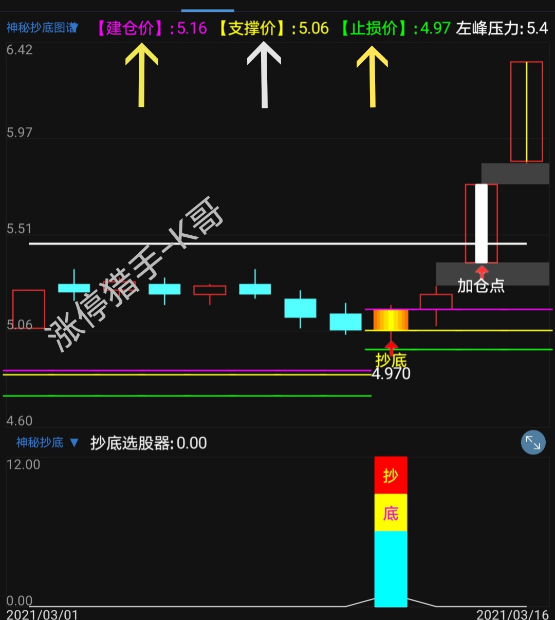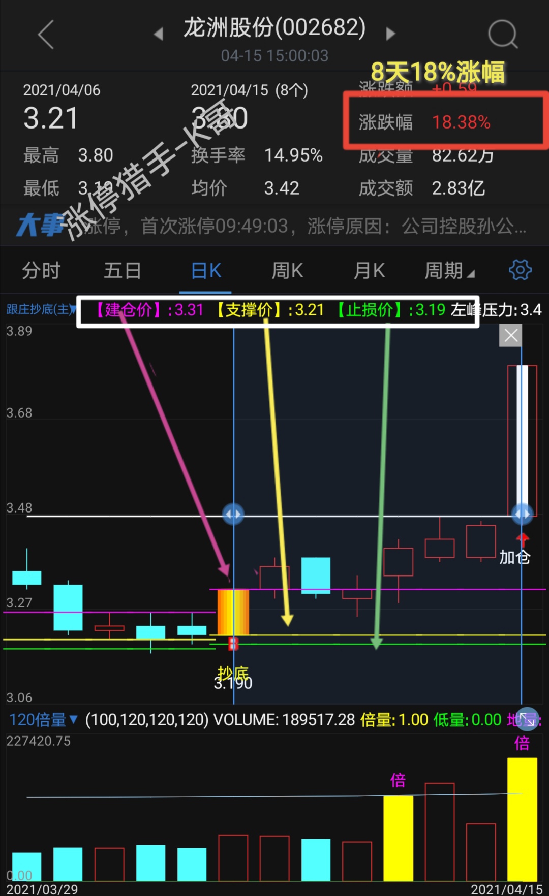 这就是我们设定的交易制度,再建仓后K线涨幅走势决定这只票的抄底是否成功,不破绿线锁仓持有,盘中可以高抛低吸,降低成本。