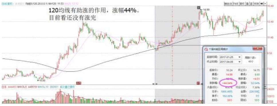 120均线的周期较长,一旦趋势形成,庄家不易制造骗线。对于很多大涨的股票,当趋势启动的初级阶段,120均线都会起到助势的作用