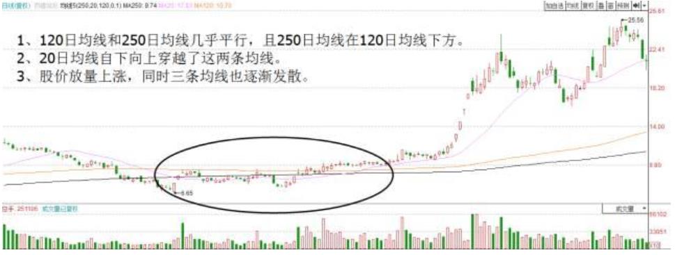 120均线与250均线并线,说明此时股价一年的平均成本与半年的平均成本非常接近,此时如果20均线先后金叉120均线、250均线,并且股价随之放量,就会使一年左右的筹码全部获利,成本共振从而引发牛股,这便是并线三线开花的意义。