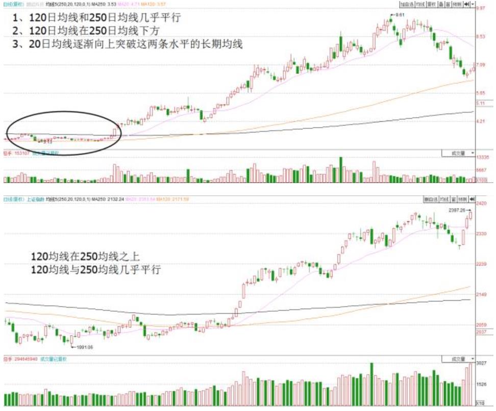 1)120均线与250均线趋于走平,并且120均线与250均线极度接近、平行。