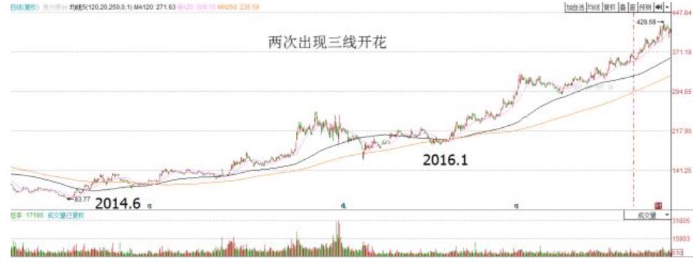 3、并线三线开花分为两种,一种是120均线在250均线之上;另一种是120均线在250均线之下。