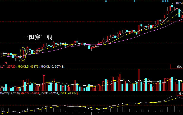 “一阳穿三线”是股价起涨的临界点,从这个点位切入,一般都会获得一段客观的利润。
