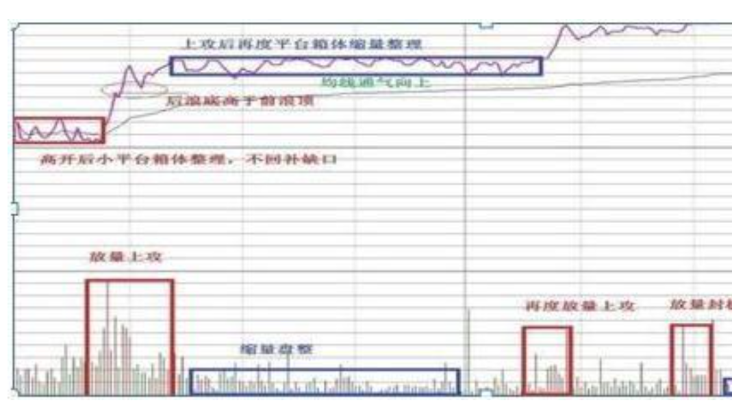 高开后高走,均线向上通气,后浪底高于前浪顶,均线跟上(带量上攻)