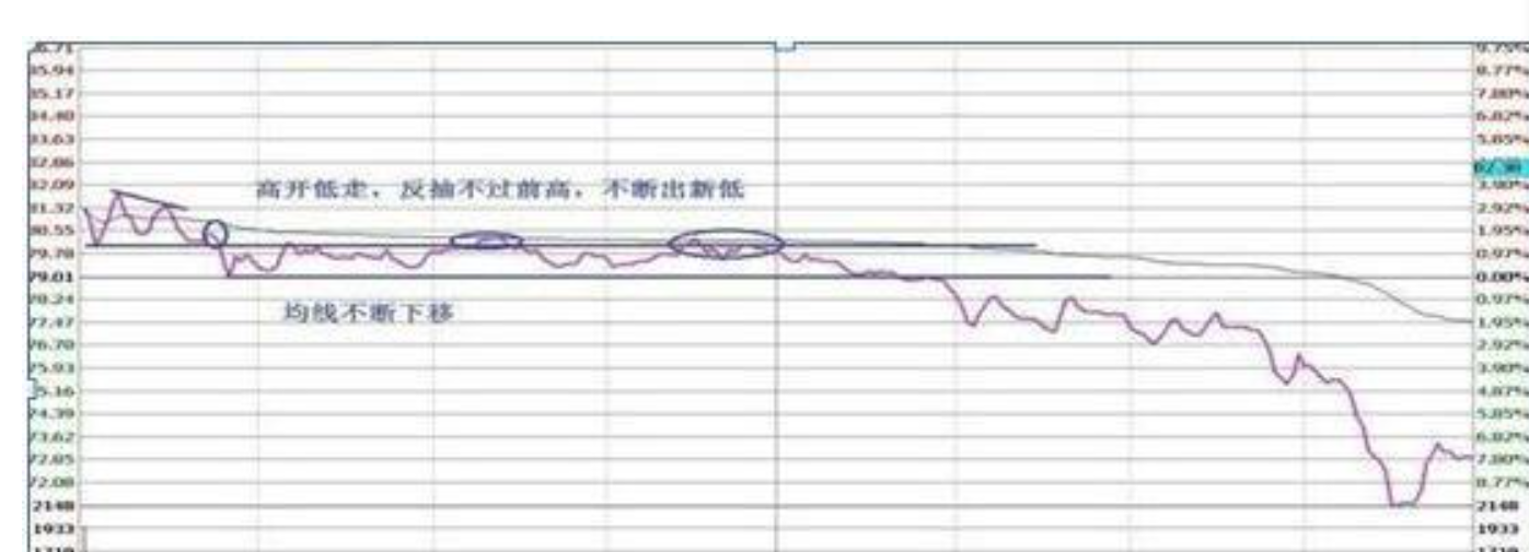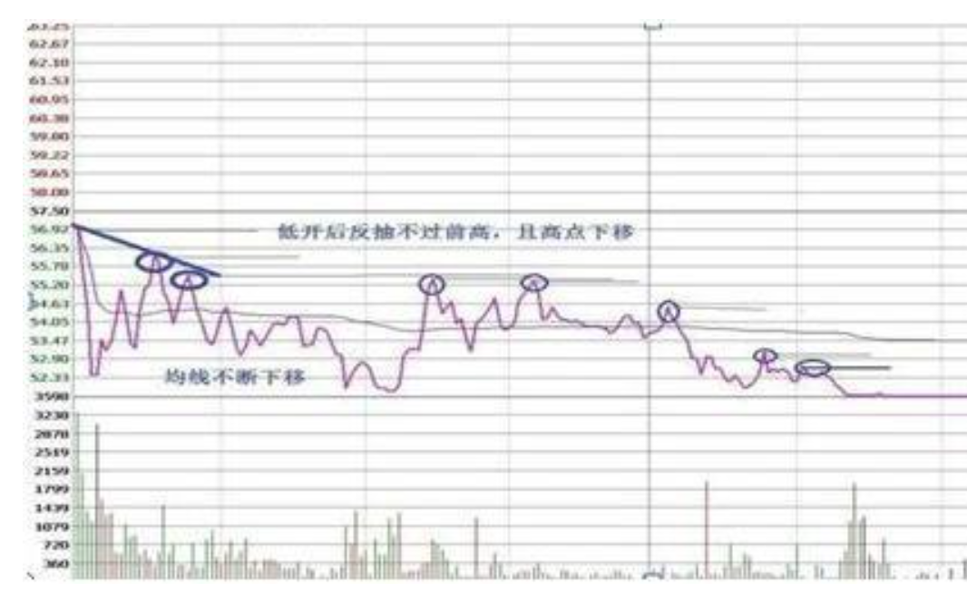 低开后反抽不过前高且高点下移,均线跟下