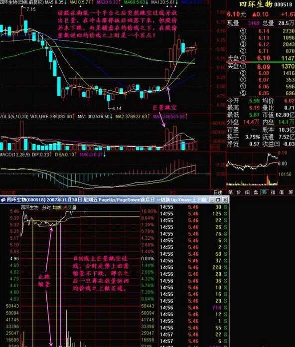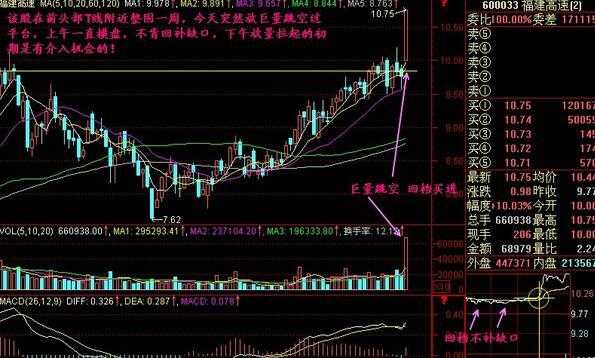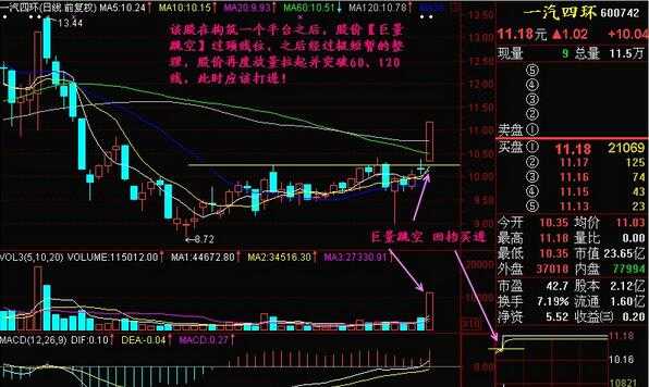 股价经前期大幅下跌后,在相对低位构筑一个平台,当某天突然放量跳空过平台,且不回补缺口,则当天可择机大胆介入。如下图所示: