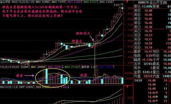 股价从底部放量建仓后,均线已成多头排列,且在底部上涨20%--30%区处构筑洗盘整理平台,当其再次放量强势(以大阳及涨停板)突破整理平台时(整理平台不能破20日均线),则当天可大胆买入。如下图所示: