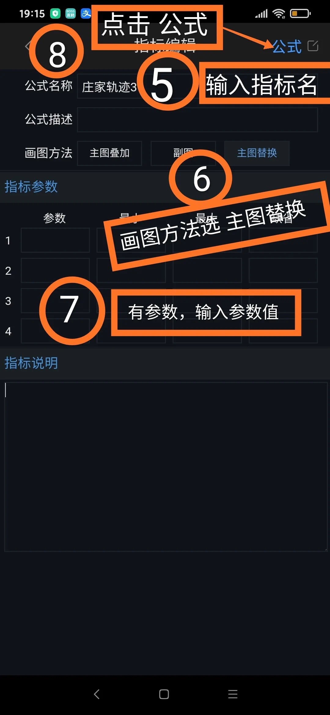 第五步,在新建指标界面,依次输入 指标名称,不能与现有的重名,并选择主图替换,如有参数,再输入相关参数,及参数取值上下限,最后,点击右上角 公式两字。