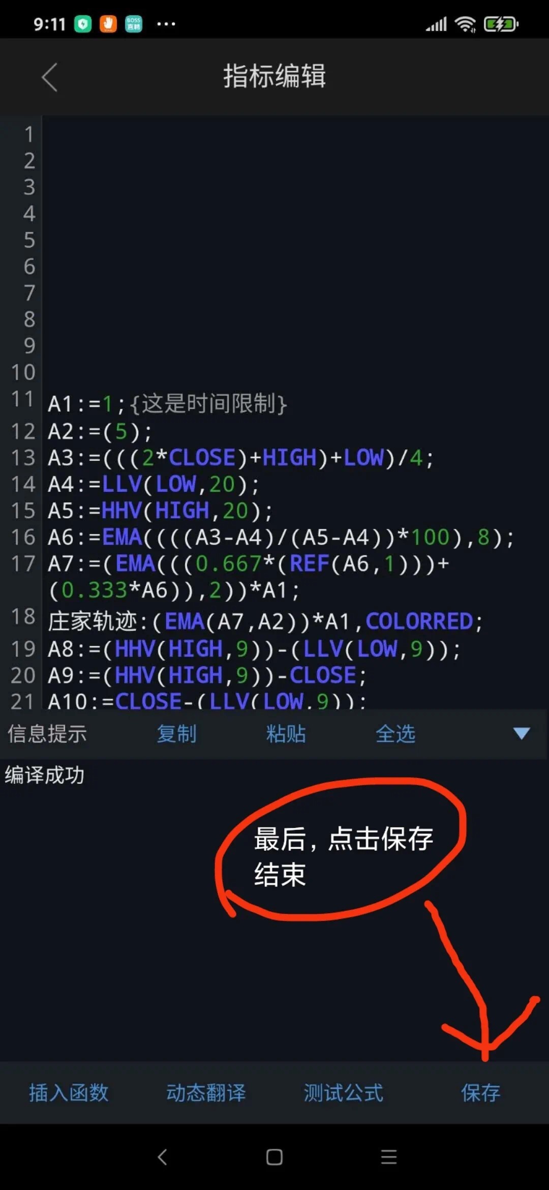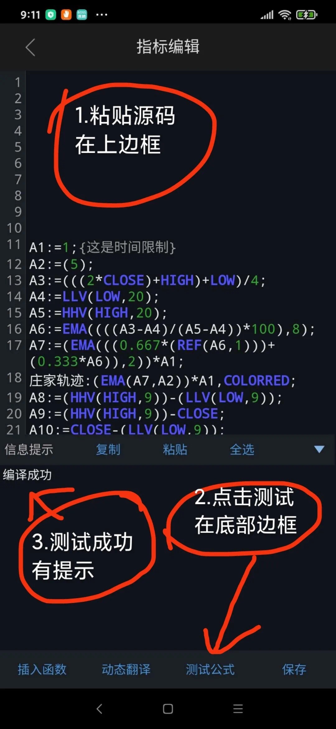 ⚠️注意事项:1.你在安装手机版通达信主图指标前,必须准备好主图指标名称和源代码,没有源代码,是没法干活的2.源代码必须是在英文状态下复制粘贴,防止出错。所以符号必须是英文符号,否则测试公式时会提示出错的。 今天的讲解就到这里,你学会了吗,请留言给我!