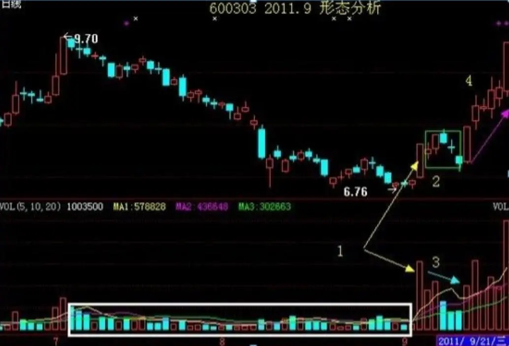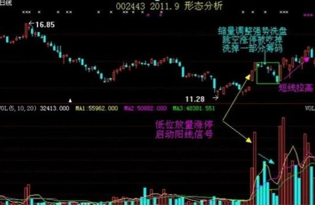 1、股价在第一波大幅拉升的过程中最好有涨停板出现,并且成交量持续放大。