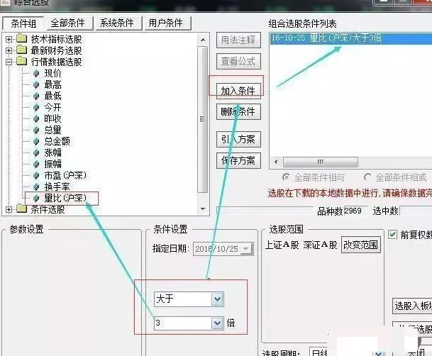 2. 在综合选股里面选择“实时行情选股”设置量比,然后加入到“组合选股条件”中。