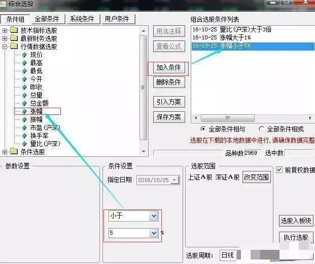 3.在“实时行情选股”中,再把涨幅条件设置好,加入到“组合选股条件”中。