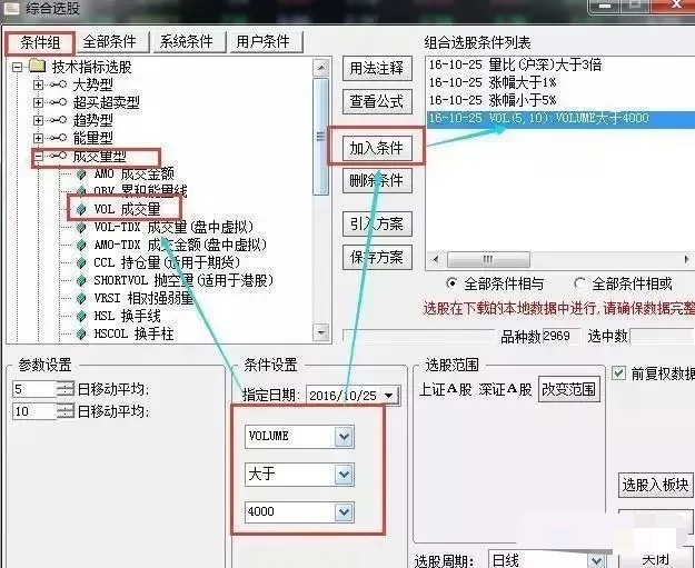 4. 在“指标选股”中,打开“成交量型”,然后选择“VOL 成交量”,设置好成交量的条件,加入到“组合选股条件”中。