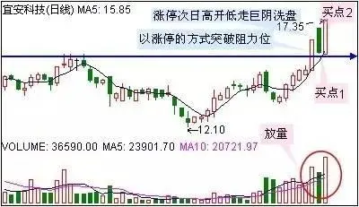 第一步,精选以涨停的方式突破前期阻力位个股。从涨停时间来看,最好是早盘封住涨停的股票,其次是下午开盘一小时内,尾盘封涨停的股票要放弃,同时均线系统要成多头排列。从涨停封单来看,不能过大也不要太小,盘中多次打开涨停的要放弃。