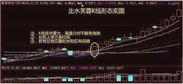 出水芙蓉的出现,表明多头上攻势头极为强劲。当股价在下跌末期出现此K线形态,说明股价见底,后市将回升,其上攻力度的强弱取决于成交量的大小。