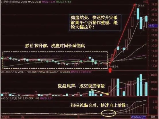 实战案例:ST罗顿,该股在2000年1月份,股价带量突破20日、62日和133日均价线的阻力,跃至中长期均价线系统的上方附近企稳。稍事整理后,即连续走出上扬行情。该股走势为典型的短、平、快走势。
