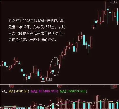 天衣无缝是指股价在低位出现直接横线涨停,形成反转形态,次日在3%以内构成短线买点。这种无量横线涨停一方面说明主力已经提前逢低完成建仓动作;