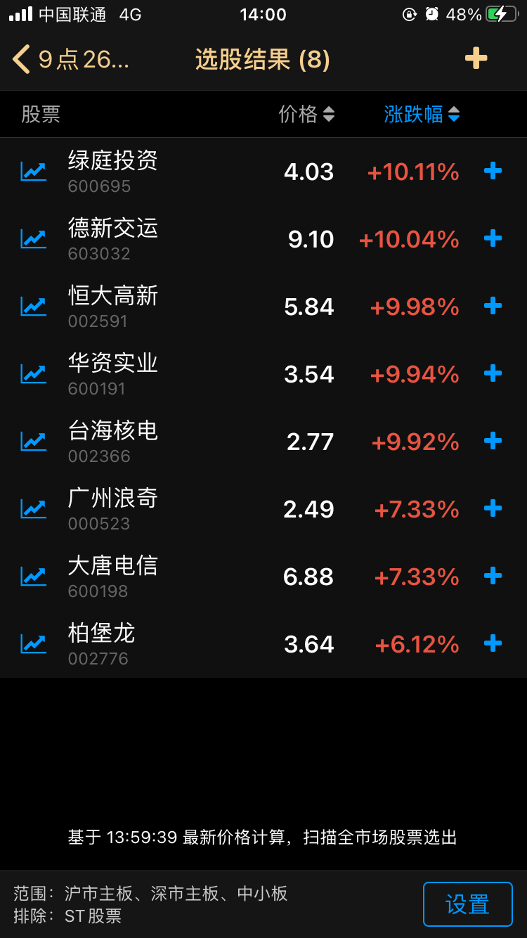9点26选股V2.0 关注公众号“ 肥尾量化平台 ”,公式 一键选股 早上9点26选股,根据热点板块和公司业绩选择性买入,当天涨停,第二天可卖出。选股后可以点击右下角的设置,板块选择只选择沪市主板和深市主板。欢迎试用提建议。股市有风险,投资需谨慎。