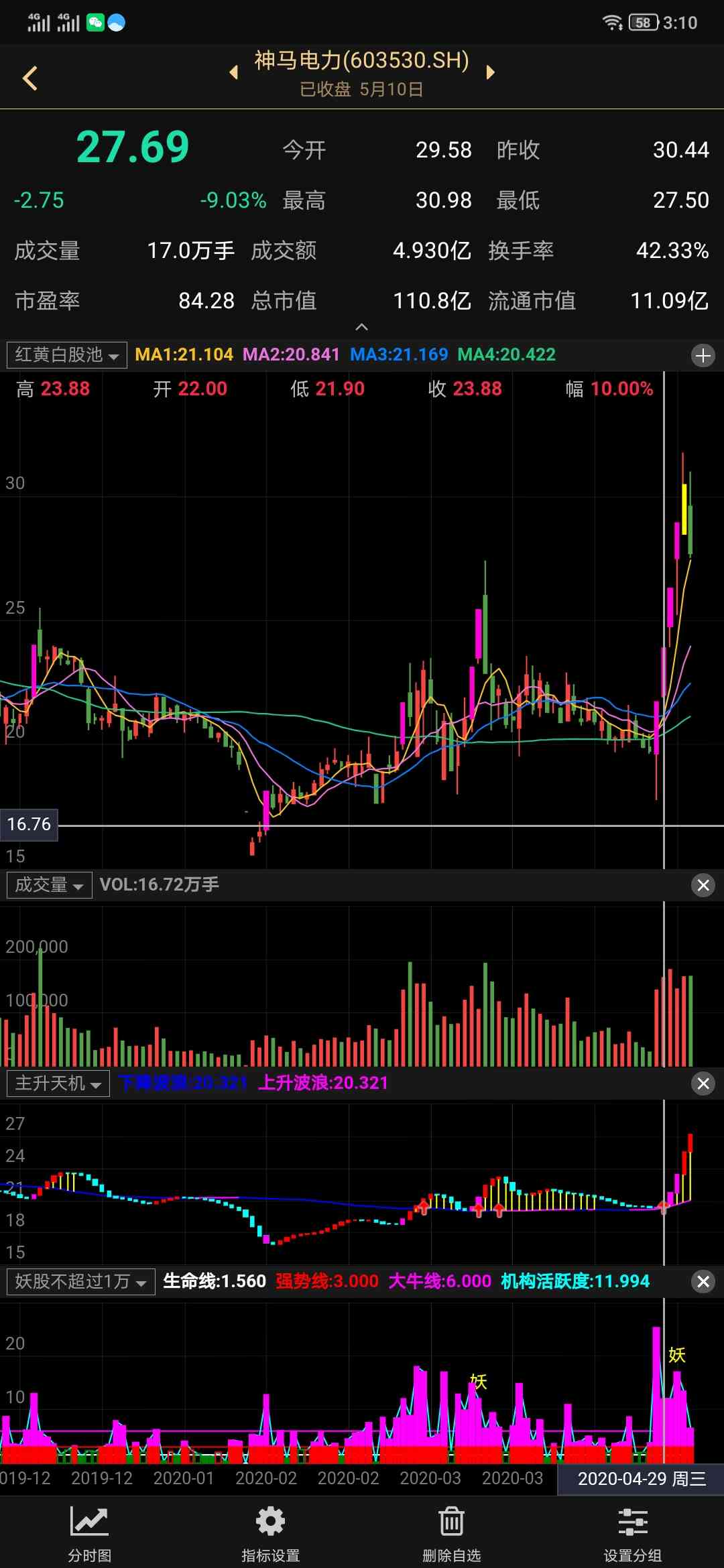 精选主升天机👍指标在手一目了然👍教你判别主升浪💯想挣钱必备 关注公众号“ 肥尾量化平台 ”,公式 一键选股 1. 紫色曲线为上升波浪,蓝色曲线为下降波浪;2. 红色粗柱体表示短线走强,绿色粗柱体表示短线走弱;3. 黄色细柱表示阶段放量,紫色粗柱表示股价当天涨停;4. 箭头表示主升浪的启动点。四维度,判断主力动作满足无所畏惧,1上升浪红色2黄色细线阶段放量3红色柱体短线走强4操盘线上