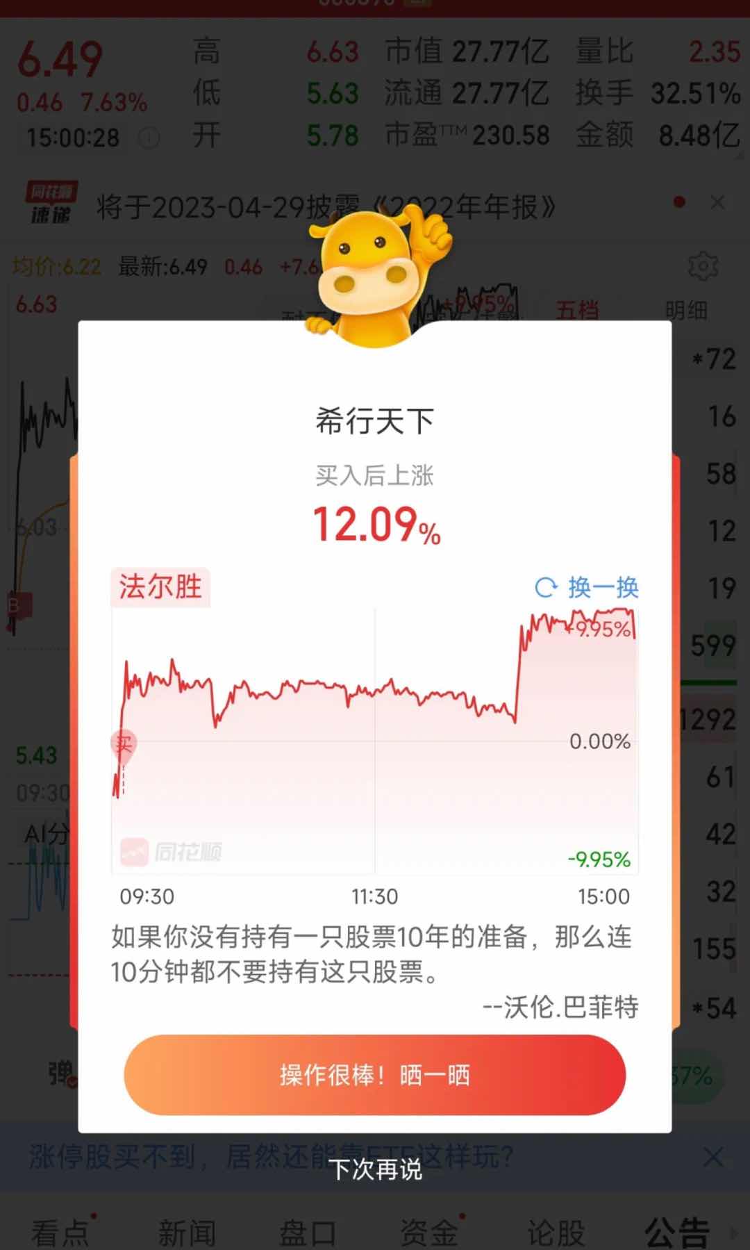 皇帝低吸牛股(有买卖提示)🔥 关注公众号“ 肥尾量化平台 ”,公式 一键选股 5年20万已到300万~㊙️圈主要实时分享我的盘前计划和盘中操作。去年收益246.5点!今年已经273点!免费观察一个周实力……股海红尘,有缘相聚。4月29日浙江建投,中交地产5月5日望变电气5月6日中国医药5月9日永安药业,美利云