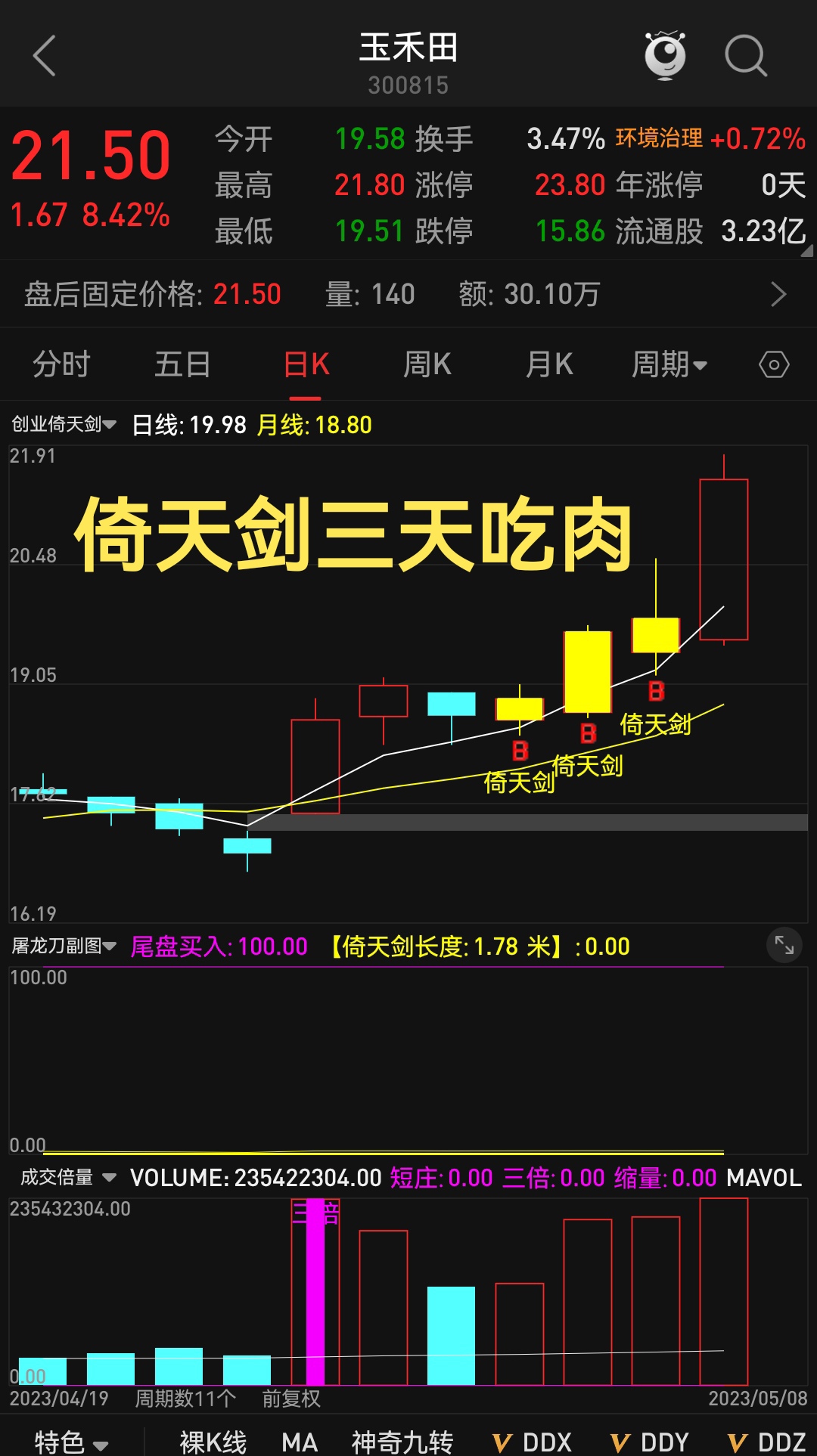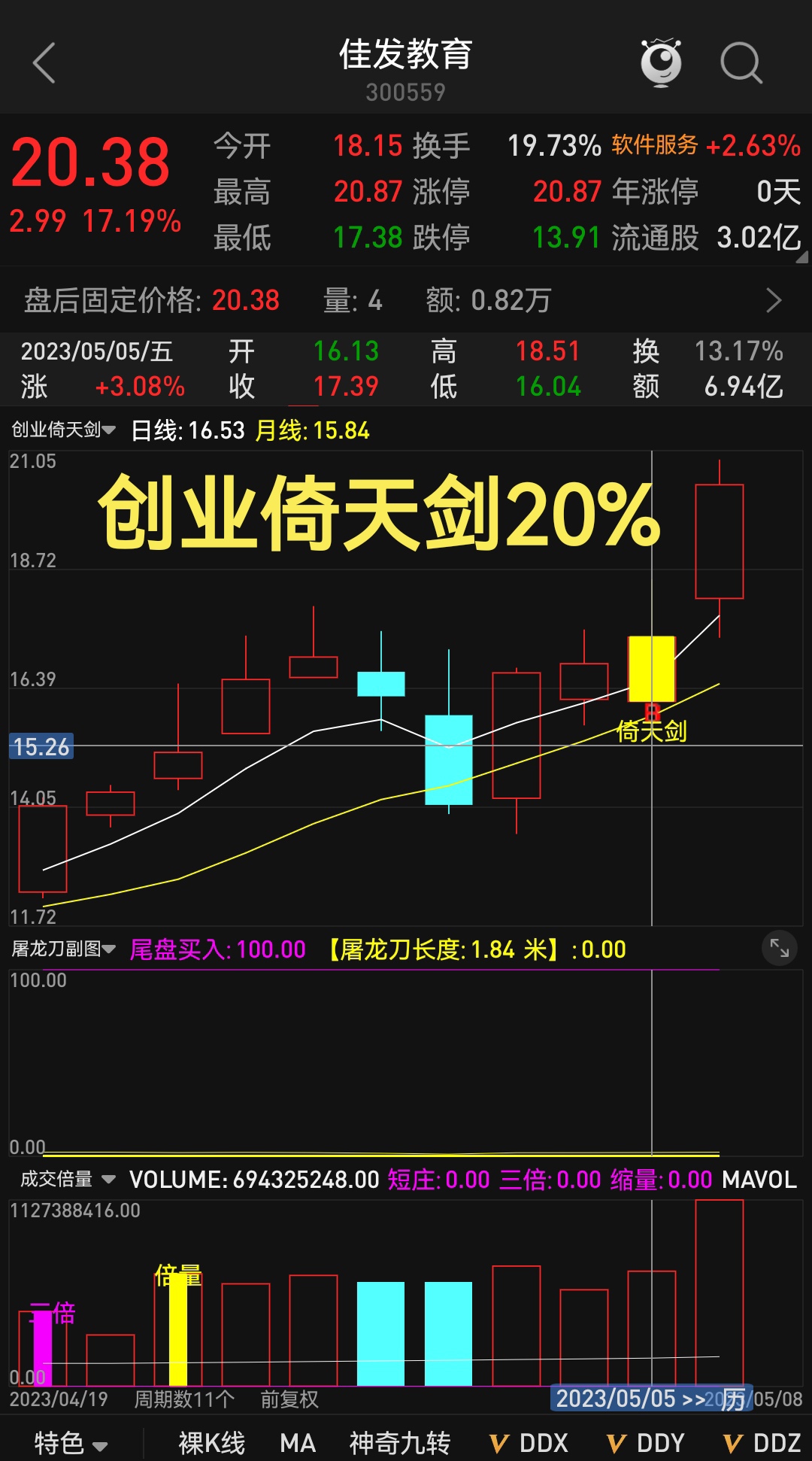 创业🇭🇰倚天剑🇭🇰 次日涨停20%大肉。 关注公众号“ 肥尾量化平台 ”,公式 一键选股 💥本公式专做创业板。💥有买点、有卖点。💥次日盈利2%~20%分批卖出下班。🇭🇰尾盘选票2.50分选票选长一把倚天剑,竞价2.57分挂高2毛钱买进收盘即可成交。🇭🇰(订阅领取限时福利)一次订阅🈵3个月送【分时买卖神器】指标一次订阅🈵4个月送【主力操盘主图】指标