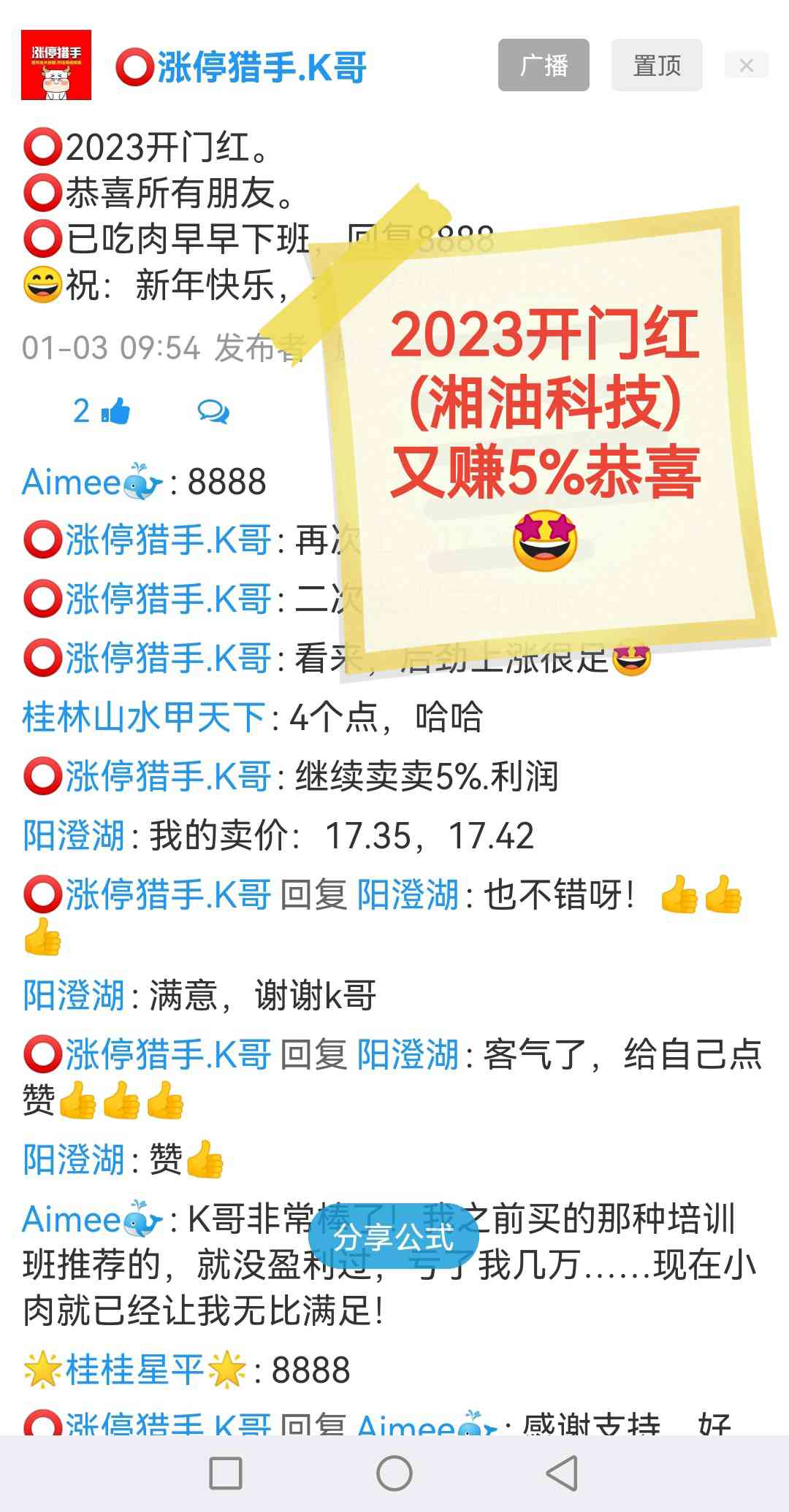 恭喜开门红🤩湘油科技,晶科科技吃大肉。 关注公众号“ 肥尾量化平台 ”,公式 一键选股 ⭕尾盘发射核心说明:⭕谨记、次日赚2%-10%高抛,完美吃肉!➊、每天一股,发射新票,风雨无阻。➋、最强人脑,精选牛骨,一起发射。➌、严格执行,交易制度,天天吃肉。➍、简单粗暴,安全稳健,尾盘发射。⭕当天稳健开仓,次日稳健高抛,最简单的吃肉方法,欢迎新老朋友,把握致富代码。⭕此模式,资金利用率高,非常适合小白,没时间看盘上班白领,每日基本有肉可吃。