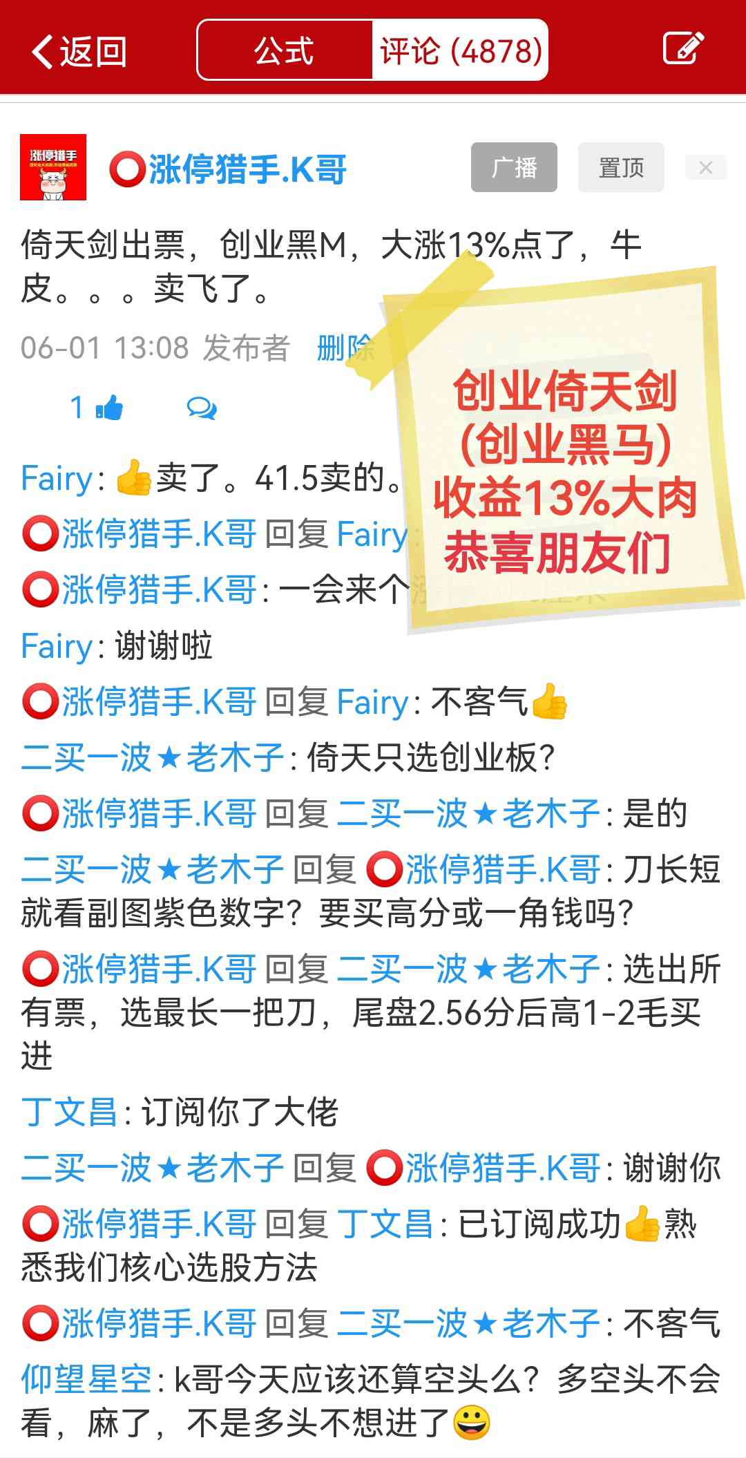 倚天剑出票,创业黑马,恭喜大涨14%🤩🤩 关注公众号“ 肥尾量化平台 ”,公式 一键选股 订阅加入尾盘“倚天剑”订阅步骤:点我头像→进入公式主页→置顶第一个“屠龙刀”点购买完成→就可以每天跟票了。操作简单:热爱短线朋友都能轻松吃肉。