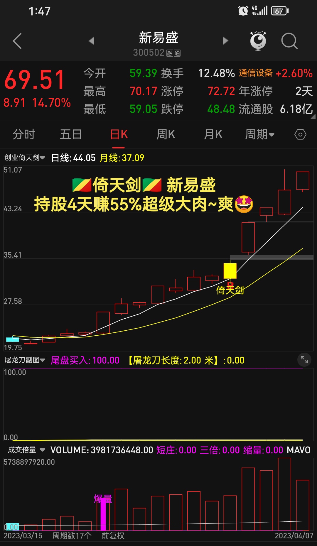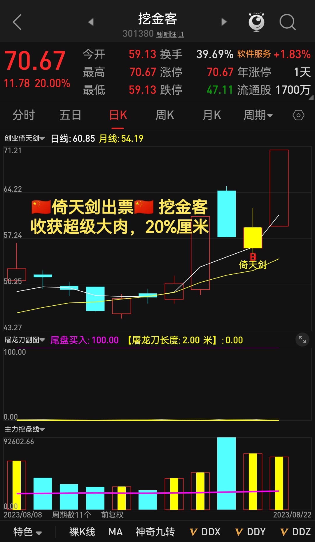 创业🇨🇳倚天剑🇨🇳 尾盘买.次日冲20%厘米。 关注公众号“ 肥尾量化平台 ”,公式 一键选股 💥本公式专做创业板。💥有买点、有卖点。💥最快次日盈利2%~20%分批卖出下班。💥持股周期最多2天不上涨卖出。🇭🇰尾盘选票2.55分发票买进,竞价2.57分挂高2毛钱买进收盘即可成交。👉跟主板票订阅→🇨🇬屠龙刀🇨🇬 👉跟创业票订阅→🇨🇳倚天剑🇨🇳🇭🇰(订阅领取限时福利)一次订阅🈵3个月送【分时买卖神器】指标一次订阅🈵6个月送【主力操盘主图】指标手机+电脑通用(永久使用+无未来函数)