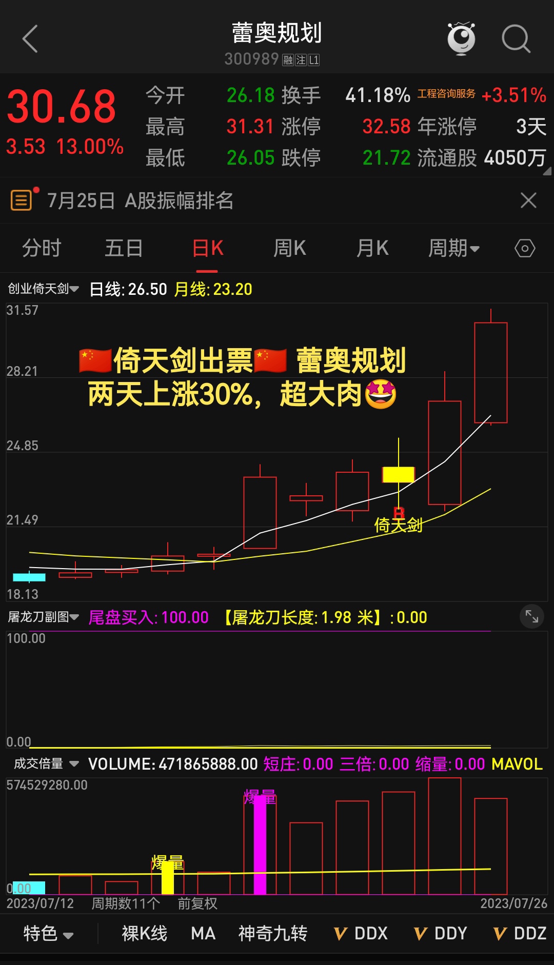 调出屠龙刀数据步骤:(点一键选股)→(点个股看到均线主图)→(点左上角+号)→(选已购买栏)→(点屠龙刀)→幅图就显示屠龙刀数据了。