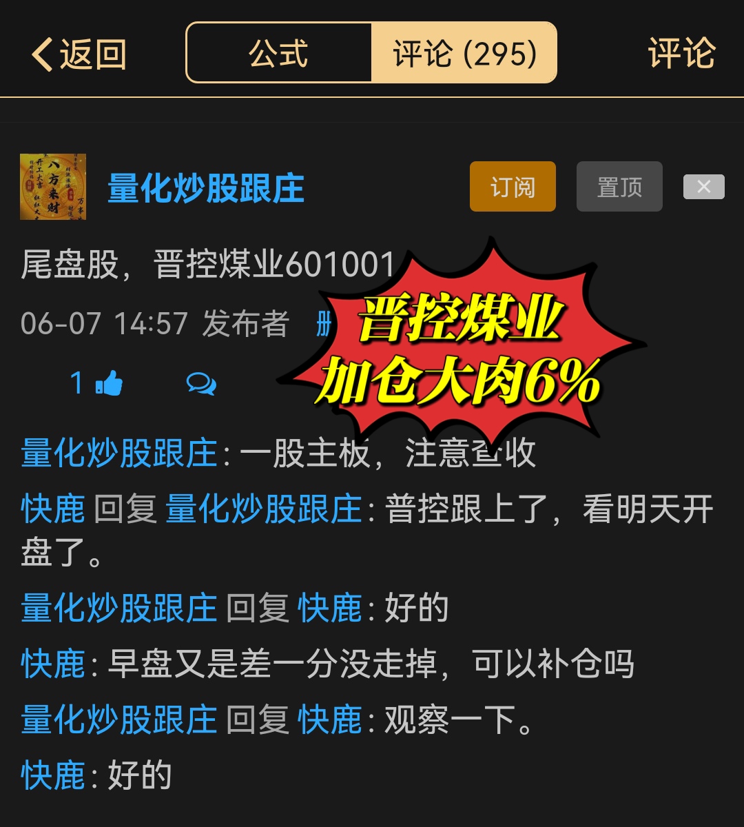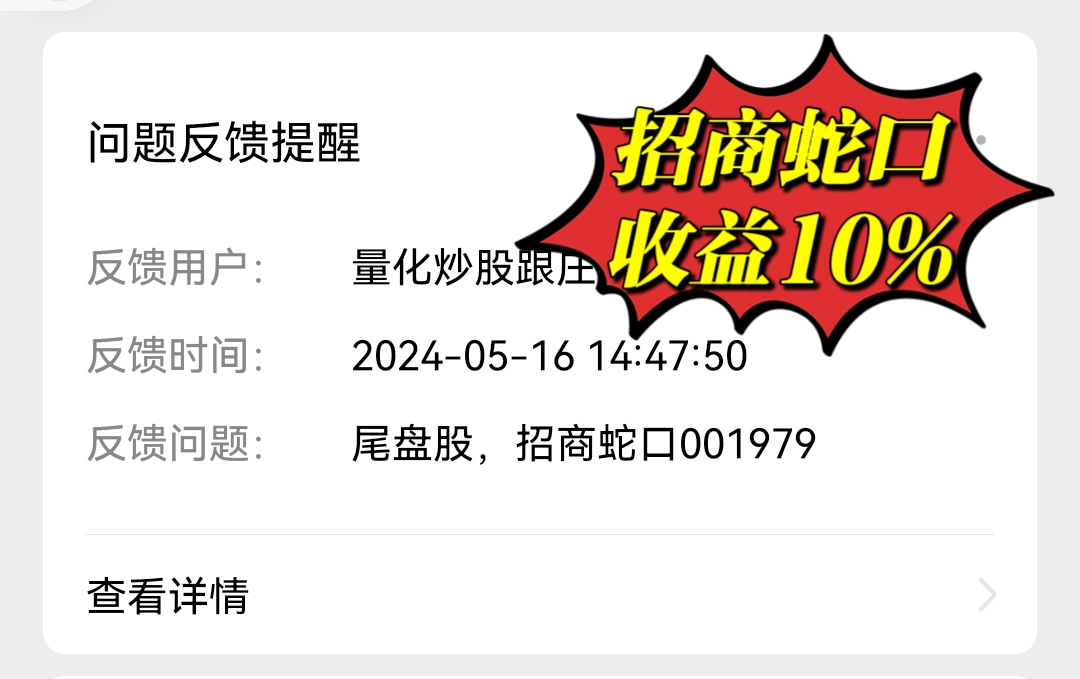 主板连胜,招商蛇口10%大肉,实力验证~ 关注公众号“ 肥尾量化平台 ”,公式 一键选股 最近操作四票吃肉回顾统计 15号尾盘,中新集/团,两天大涨8% 16号尾盘,招商蛇/口,涨停10% 17号尾盘,南矿集/团,冲高3.8 % 20号尾盘,保利发/展,冲高2.6% (订阅一天一股尾盘发布,隔日大涨卖出,今买明卖交易战法胜率85%以上)