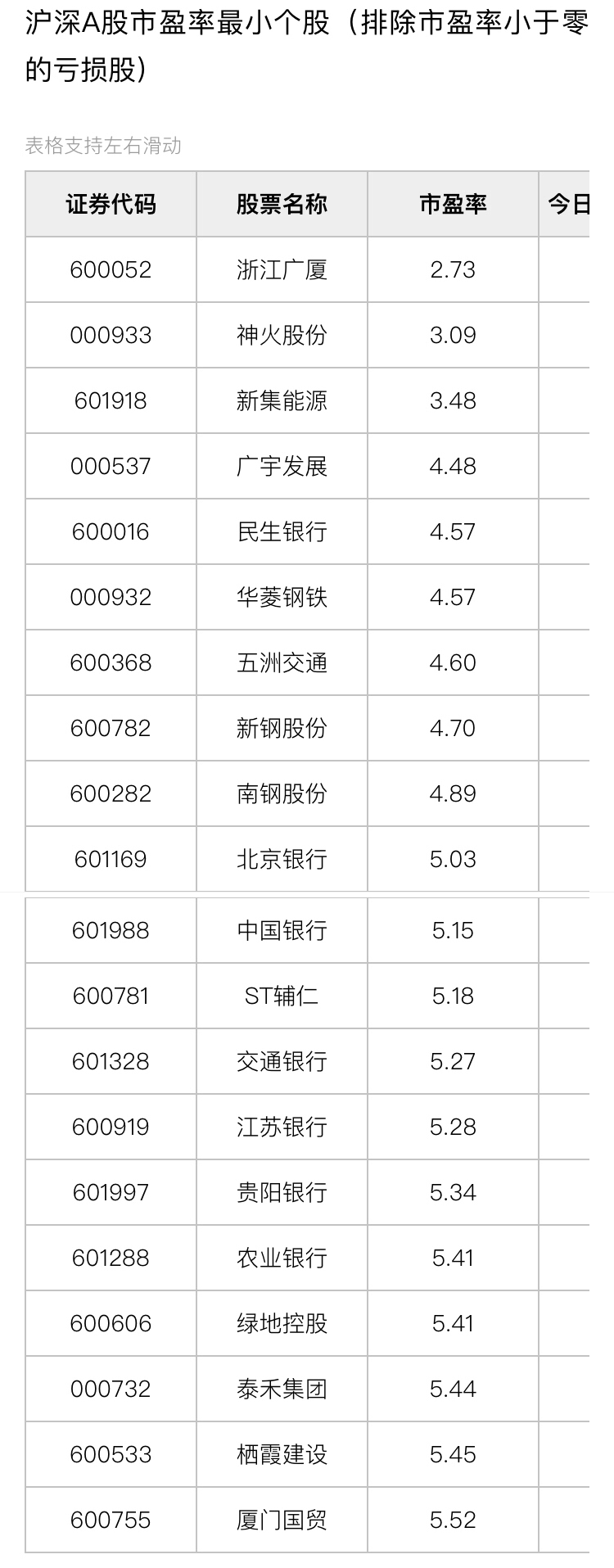 沪深A股市盈率最低个股(排除市盈率小于零的亏损股):
