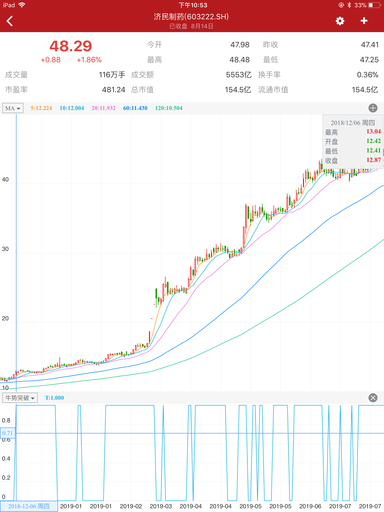 个股案例济民制药603222(2019-12-06)牛势突破指标触发信号出现后稳步上升,上升途中也有洗筹,股价一直没有跌破二十日线。